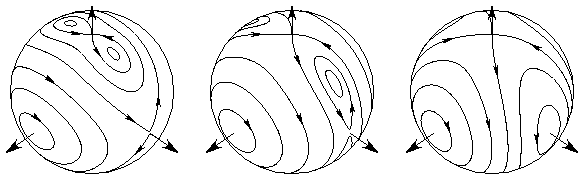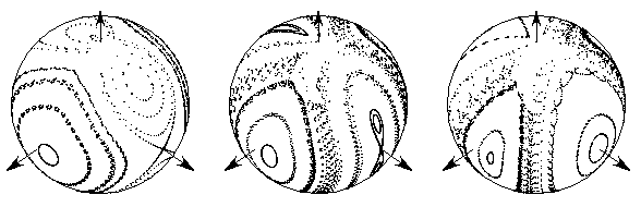Phase portraits of an approximation to the crossed-fields Hamiltonian obtained by double-averaging, represented for increasing values of the ratio (magnetic field)/(electric field). The vertical coordinate is the angular momentum projected on the electric field, while the longitude is its conjugate variable, which is related to the longitude of node. The poles correspond to a periodic orbit of the Stark Hamiltonian. The point on the equator which changes form hyperbolic to elliptic represents orbits in the plane perpendicular to the magnetic field. The elliptic point near the equator represents a more complicated, three-dimensional orbit.