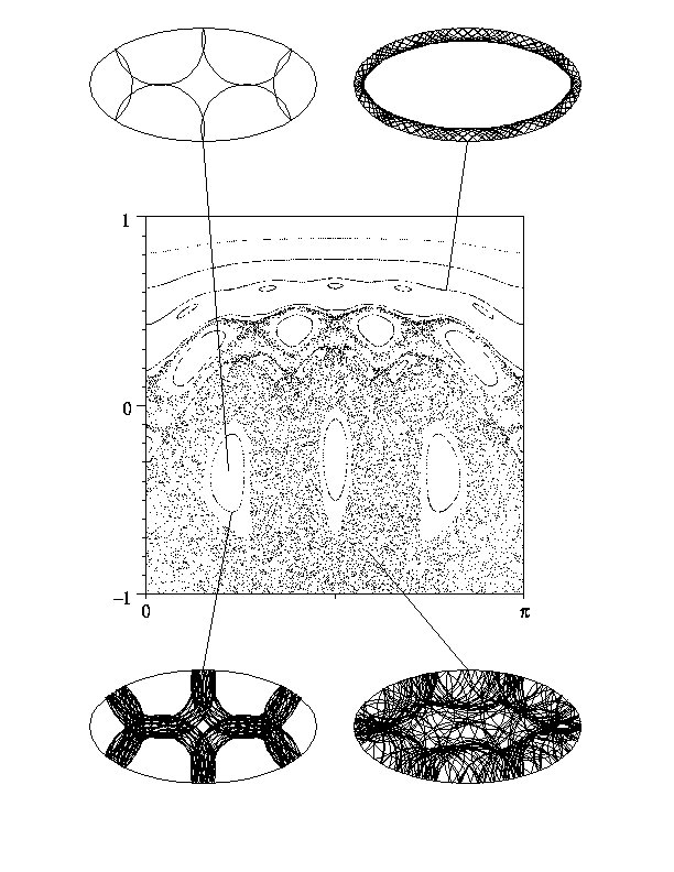 The figure shows different types of orbits of the billiard in an ellipse with a magnetic field. The central picture is the Poincaré map, with each point representing a collision of a trajectory with the boundary, the abscissa parametrizing the position on the boundary, and the ordinate the tangent velocity. Several orbits are shown, in particular (from top to bottom and left to right): a periodic orbit, a quasiperiodic skipping orbit, a quasiperiodic "elliptic island" and a chaotic orbit.