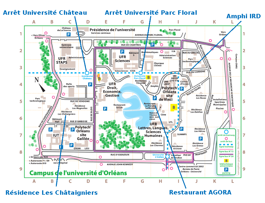 Journées de Probabilités 2013 Comment se rendre au lieu de la rencontre Des instructions détaillées pour se rendre à Orléans se trouvent ici. Si vous arrivez en voiture, voir ce plan pour localiser le campus. Pour vous rendre au campus d'Orléans - La Source depuis la gare Les Aubrais - Orléans ou Orléans Centre, prendre le tram A direction Hôpital. Pour rejoindre la résidence universitaire, descendre à l'arrêt Université Château (case D3 du plan du campus). La résidence Les Châtaigniers se trouve case C5 du plan. La conférence aura lieu à l'amphithéâtre de l'IRD, rue du Carbone. Descendre à l'arrêt Université Parc Floral (case G3 du plan du campus). L'amphithéâtre de l'IRD se trouve case J3 du plan. Le déjeuner sera pris au restaurant AGORA, case H5 du plan.