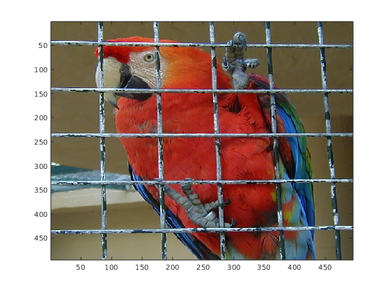 u = imread('parrot.bmp'); % size of u: size(u) % u is an RGB image (3 chanels), each having size 495 x 495. % store this values (to adapt to other images) [M, N, nc] = size(u); % M is the height, N is the width (matrix convention). figure; imshow(u); % Note that with imshow you get a faithfull display: % % One pixel of the screen is one pixel of the image. % % This is not the case with the image function: figure; image(u) % note that the aspect ratio is not preserved (fater parrot!)