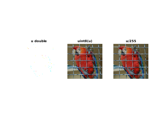 u = double(imread('parrot.bmp')); figure; subplot(1,3,1); imshow(u); title('u double') subplot(1,3,2); imshow(uint8(u)); title('uint8(u)') subplot(1,3,3); imshow(u/255); title('u/255')