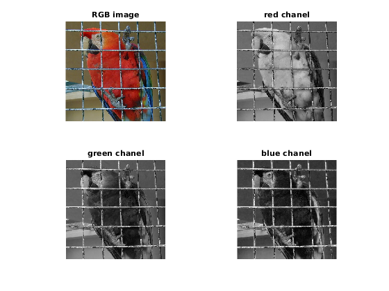 u = double(imread('parrot.bmp'))/255; r = u(:,:,1); % always use semi-column otherwise display of all coefficient in the command window... g = u(:,:,2); b = u(:,:,3); figure; subplot(2,2,1); imshow(u); title('RGB image'); subplot(2,2,2); imshow(r); title('red chanel'); subplot(2,2,3); imshow(g); title('green chanel'); subplot(2,2,4); imshow(b); title('blue chanel');