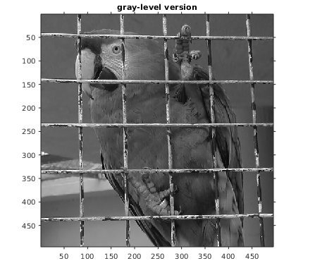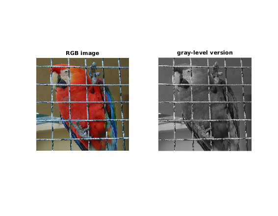 u = double(imread('parrot.bmp'))/255; y = rgb2gray(u); figure; subplot(1,2,1) imshow(u); title('RGB image'); subplot(1,2,2) imshow(y); title('gray-level version');