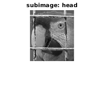 %Let us extract the parrot head in the grayscale image: u = double(imread('parrot.bmp'))/255; y = rgb2gray(u); % First display image with axis: figure; imshow(y); title('gray-level version'); axis on; head = y(30:180, 70:200); figure; imshow(head); title('subimage: head');