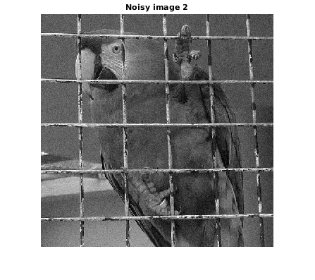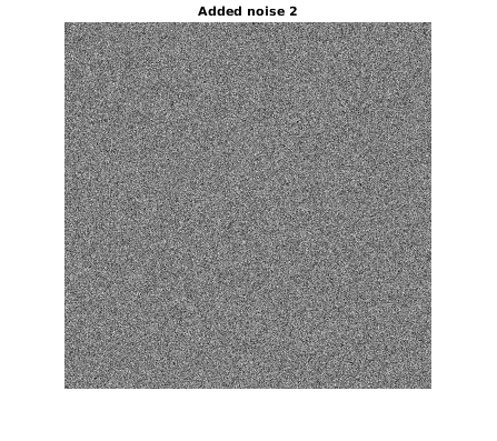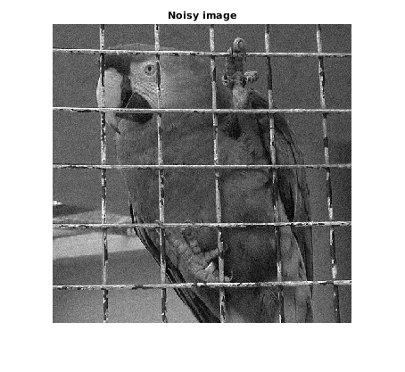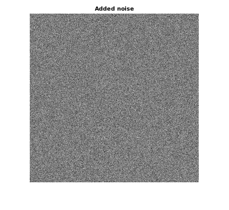 u = rgb2gray(double(imread('parrot.bmp'))/255); % add Gaussian noise: m = 0; sigma = 10/255; unoisy = imnoise(u,'gaussian', m, sigma^2); n = unoisy-u; figure; imshow(unoisy) title('Noisy image'); drawnow figure; imshow(n,[]) title('Added noise');