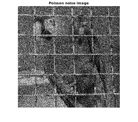 c = 5; upnoisy = random('Poisson', u*c)/c; % division by c to keep original range figure; imshow(upnoisy) title('Poisson noise image'); drawnow figure; imshow(upnoisy-u,[]) title('Difference');