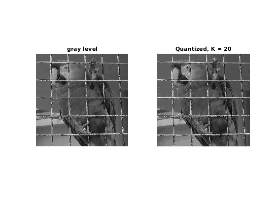 u = rgb2gray(double(imread('parrot.bmp'))/255); K = 20; % for images having gray-levels in [0,1]: uquant = (floor(u*(K-1)+0.5))/(K-1); figure; subplot(1,2,1) imshow(u); title('gray level'); subplot(1,2,2) imshow(uquant); title(['Quantized, K = ', num2str(K)]);