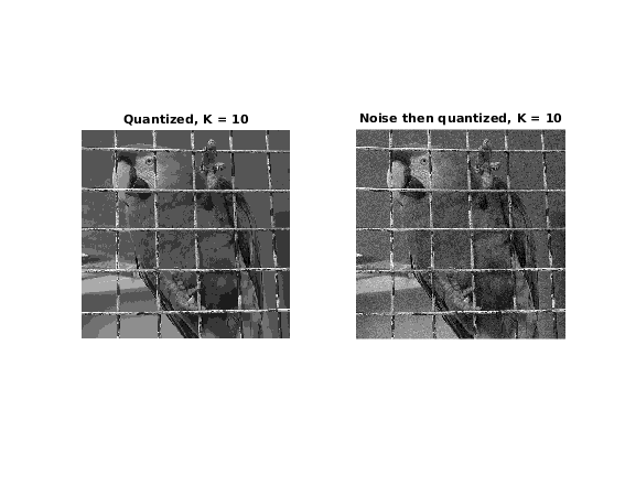 With a quantization of K=10, compare the quantized result of u and u corrupted with additional Gaussian white noise. For which range of standard deviation do you think the result is more pleasant?