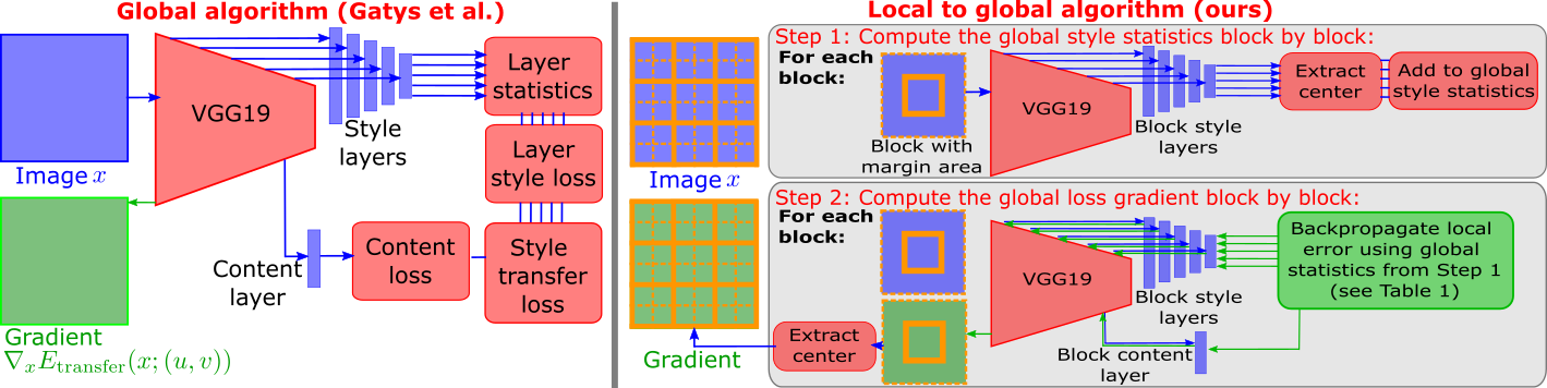| Algorithm overview: Our localized algorithm (right part) allows to compute the global style transfer loss and its gradient wrt x for images that are too large for the original algorithm of [Gatys et al. 2016] (left part). |